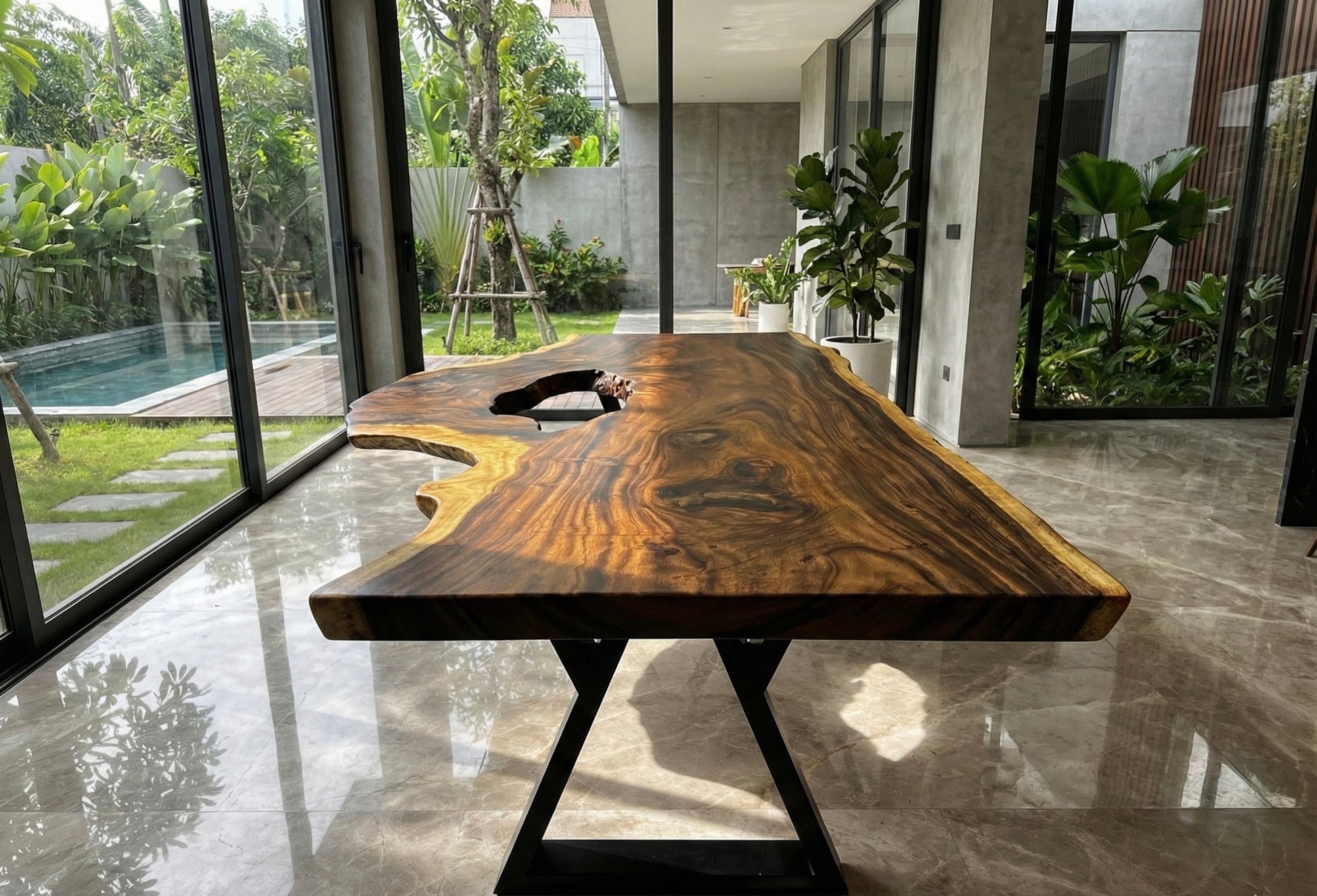 طاولة من الخشب الصلب ذات حافة حية غريبة مع أرجل معدنية مثالية للديكور المنزلي.