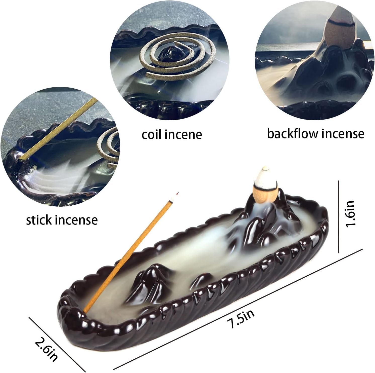 - 3-in-1 incense holder for re flow cartridges, incense sticks and incense trays. When burned, the smoke flows slowly like a waterfall, it relieves your stress and provides a comfortable and relaxing atmosphere.