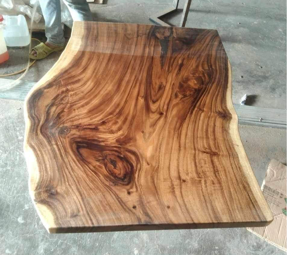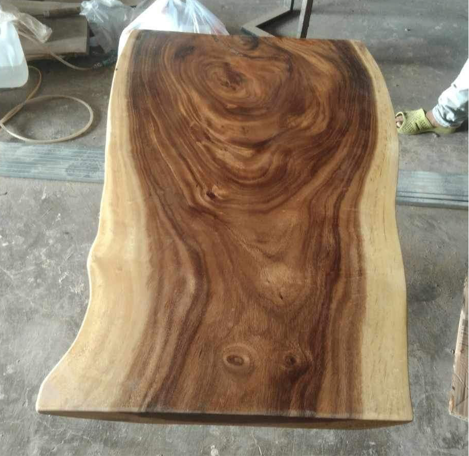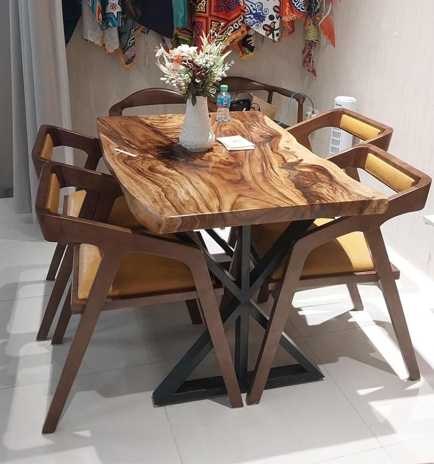 Discounted Price Dining set, Live Edge Wood Solid Dining Table - Saman Wood with PU Finish, Black Metal Legs - and Katakana chairs, Ideal for Home or Restaurant. Medium size with 4 chairs and Large Size with 6 chairs