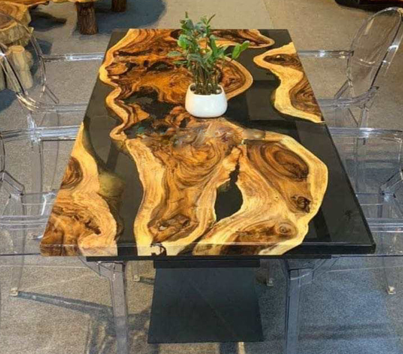 Invest in the Premium Live Edge Solid Wood Dining Table Top Enhanced by Epoxy Resin black river Finish and elevate your dining experience. With its unique design and high-quality materials, this table is sure to impress and become a staple piece in your home. Don't miss out on the opportunity to add this stylish and functional piece to your furniture collection.