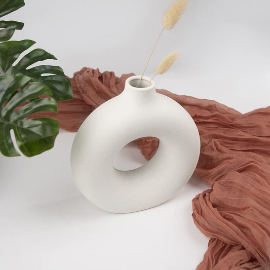 White Circular Ceramic Vase Stylish Table Centerpiece for Home Decor.