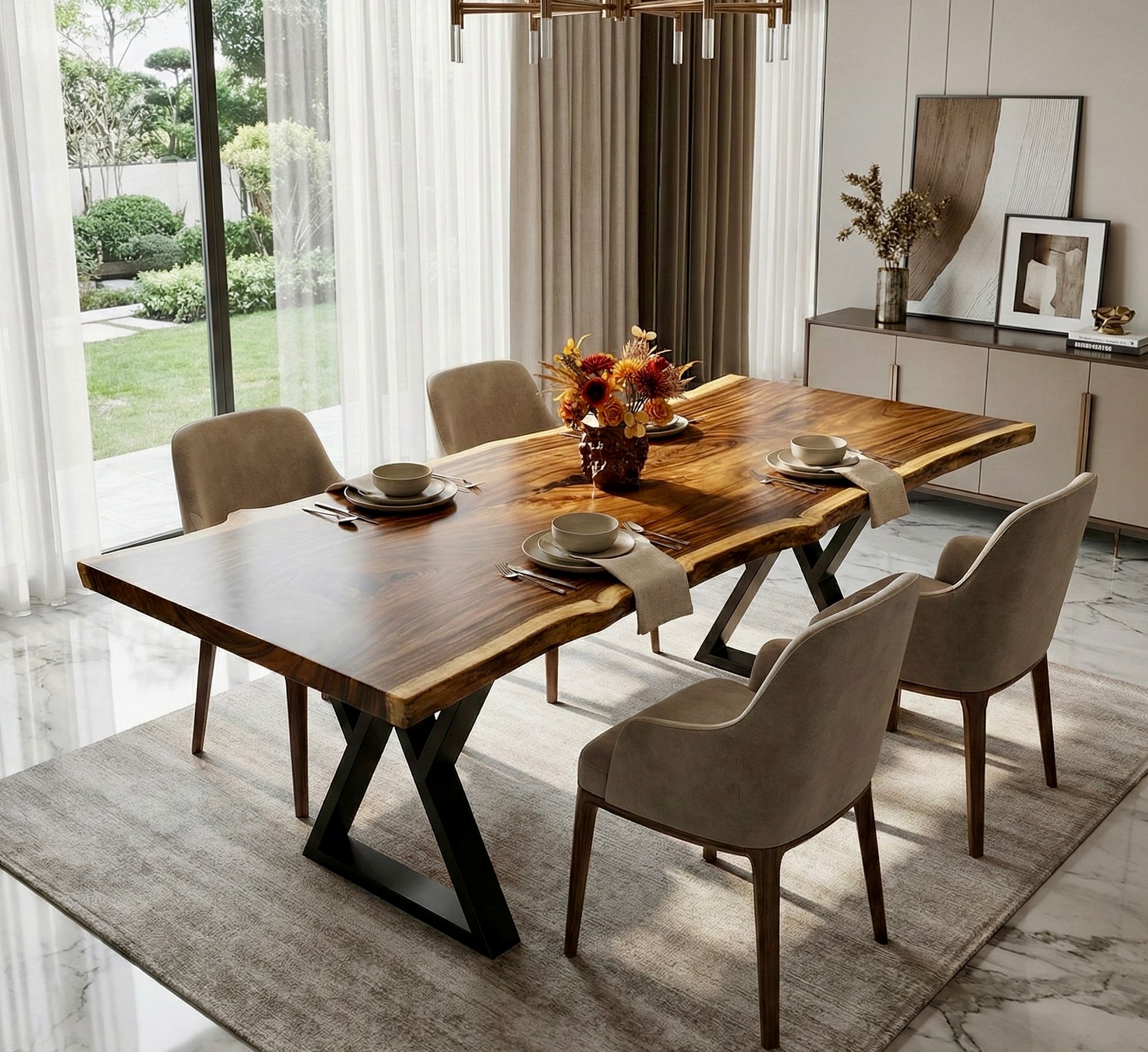 Exotic Live Edge Solid Wood Table with metal legs perfect for home decor.